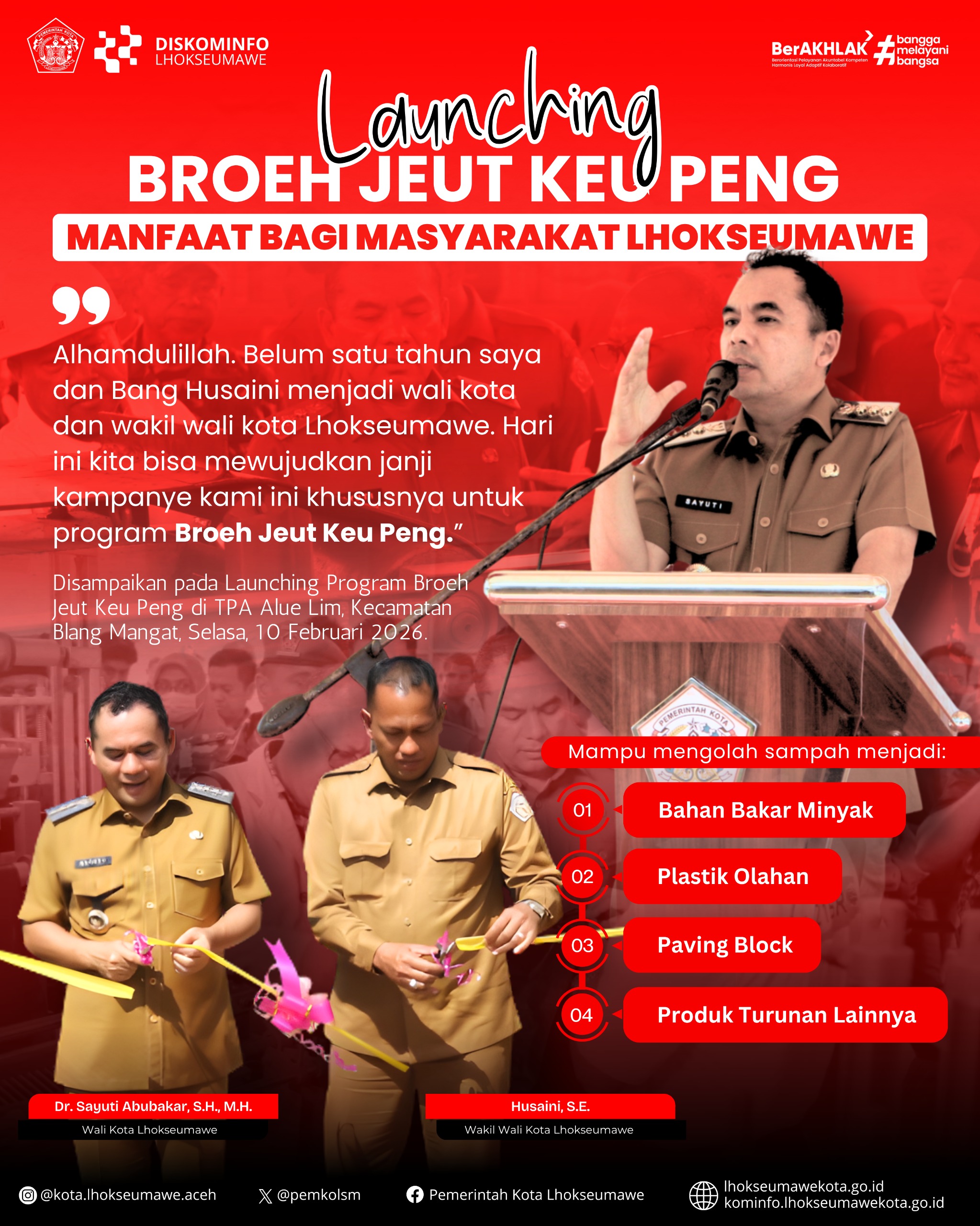 Lhokseumawe — Pemerintah Kota Lhokseumawe resmi meluncurkan Program Broh Jeut Keu Peng (sampah jadi uang) dengan mengoperasikan mesin pengolahan sampah berbasis teknologi terbarukan di TPA Alue Lim, Kecamatan…